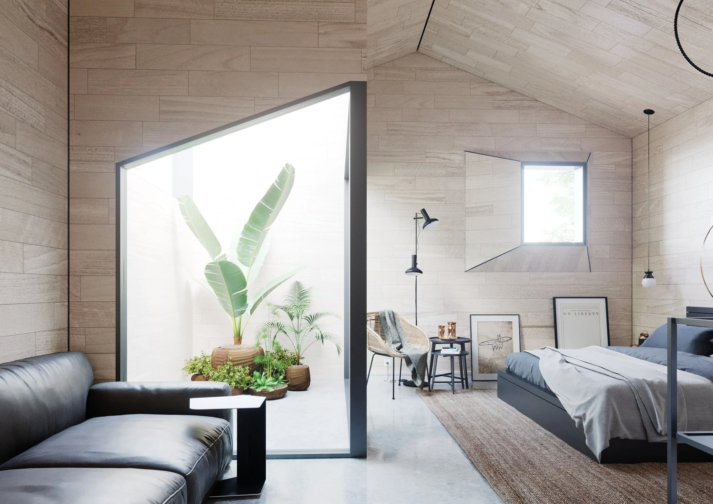 Thoughtful design that harnesses natural light through strategically placed angular windows.